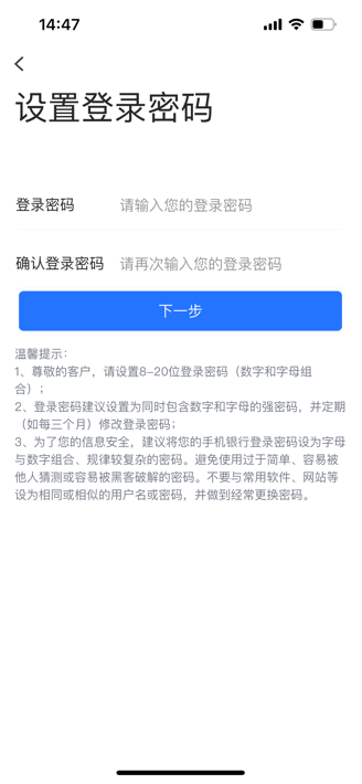 5、录入登录密码信息(登录密码、确认登录密码),点击下一步。